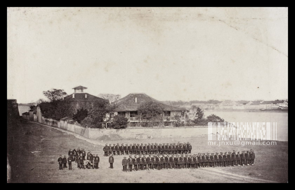 这张照片来自英国某博物馆收藏的包腊相册,包腊当时在宁波海关任职。照片说明清楚地写着是“Anglo-Chinese force on parade”,即江边的中英军队,左侧是宁波城的城墙,军队后面的建筑即宁波海关。这张照片的获得感谢rishon、HK和黑龙。