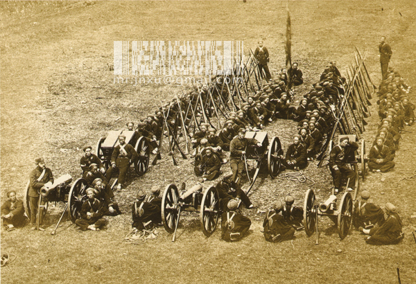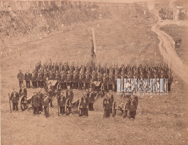这张照片来自私人收藏,从城墙、小路、背后的建筑都可以判断出拍摄地点同上一张。只可惜由于风和长时间曝光的原因,旗子上的字看不到。这支军队配有三门口径不同的火炮,后面的箱子我猜测是弹丸和火药,每门炮还有专人擦拭炮膛内残留的火药(一旁拄“棍”者)。
