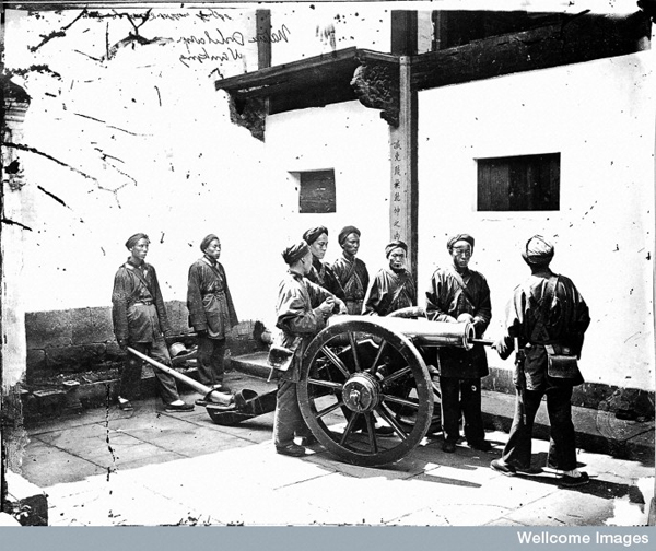 这张照片有约翰•汤姆逊拍摄,没有发表过,收藏在维尔康姆图书馆。从士兵的打扮和大炮的样式能判断出也是“绿头勇”的。