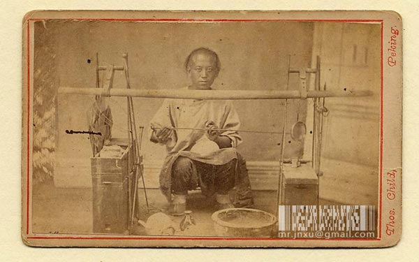 5. 你说的这个问题,我记得以前我曾找过Thomas Child的资料,John Thomson你也应该了解.我还找过一篇文章《旧北京照相业的兴衰》,这存在着一定的联系.John Thomson的文章中曾提到他的一位姓杨的爱好摄影的中国人.他作品中还有此人的照片.而《旧北京照相业的兴衰》中提到一位叫”杨远山”的人,他20世纪前在北京开设了照相馆.具体开设时间待考.但这些照相馆毁于庚子年.这里我并不肯定这位”杨远山”应该就是John Thomson作品中所提到的那人.但Thomas Child和这位Yang确有关系.在Google图书中查阅到有一本书名为《The PhotoHistorian》,此书不提供预览.只有摘录视图.其中有一段可以看到的文字大意是,Child工作于Yang’s water pump and installed his gas lighting. 再一下句还提到了Dr.Dudgeon. 这段话表明,其实CHILD、Thomson、Yang、Dudgeon都是互相认识的人.而且如果这位杨姓人士后来有开照相馆的话,查尔德是有可能在照相馆服务的.他自己开过不能确认,但可能确认他服务于照相馆,或许为这位杨姓人士所开办的照相馆中.
