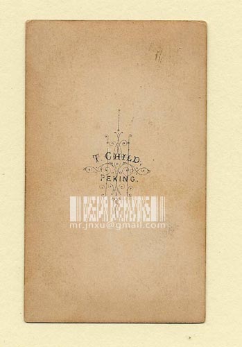 2. 我想在那个全中国也没几个洋人的年代,如果是T.Child就应该是Thos. Child了,重名的可能性太小了——除非,照片是假的。如果照片是真的,那起码改写了两项摄影史记录吧:1,提前了北京有记载最早照相馆的年份;2,半身肖像也是存在的(以前有发现过吗?不过我是没见过)。
