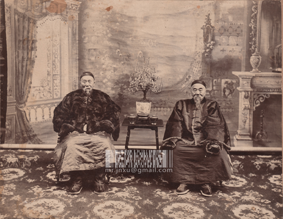 两家男丁合影那张照片我在没见到实物之前一直以为是蛋白照片,但是见过3次实物后,认定这张照片应该是早期的明胶照片,这次见到李鸿章、李翰章两兄弟的合影更确定了原版即明胶照片的事实。普遍认为明胶照片是1900年进入中国的(都是德国人的产品),没想到当时的上海的照相馆如此开放如此先进,在1896 年就已经能熟练洗印明胶照片,看来以后的断代需要小心了。
