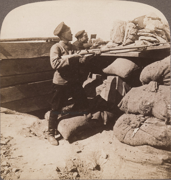 当我看到这张照片和解说时,心里一颤,耳边响起了苏联民歌《小路》凄婉而透着坚毅的旋律:“一条小路曲曲弯弯细又长,一直通往迷雾的远方,我要沿着这条细长的小路,跟着我的爱人上战场……我要变成一只伶俐的小鸟,立刻飞到爱人的身边……我要勇敢地为他包扎伤口,从那炮火中救他出来……”一位守望爱情,生死相许,温柔而坚强女性形象在歌曲声中跃然而出。都说“战争”与“爱情”亘古以来是文艺作品的永恒主题,这首歌,或者说这张照片的故事,两个主题都占了。在人类社会发展的早期,也许战争无所谓正义与非正义,弱肉强食,生生不息。而这张照片的故事却是发生在文明社会,历史已走进了二十世纪,沙俄与日本两个强盗,为了争夺在中国的地盘,在中国的土地上开展殊死的拼杀。