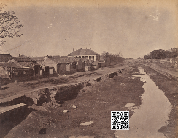 佚名于1890年代在中御河桥上向北拍摄的御河,左边的坡顶建筑即英国使馆