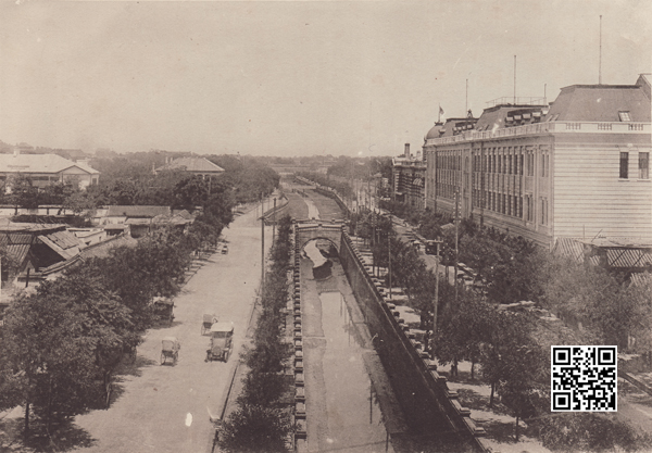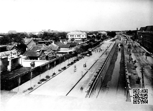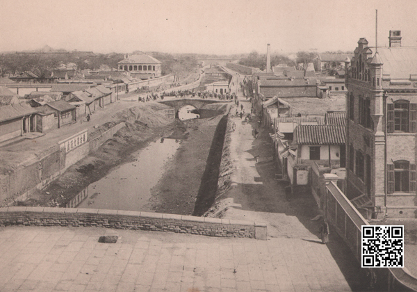 佚名于1909年在内城城墙上向北拍摄的御河,图片来自1917年版《北京写真帖》。河岸经过整修,英国使馆多了新建筑,六国饭店也扩建了