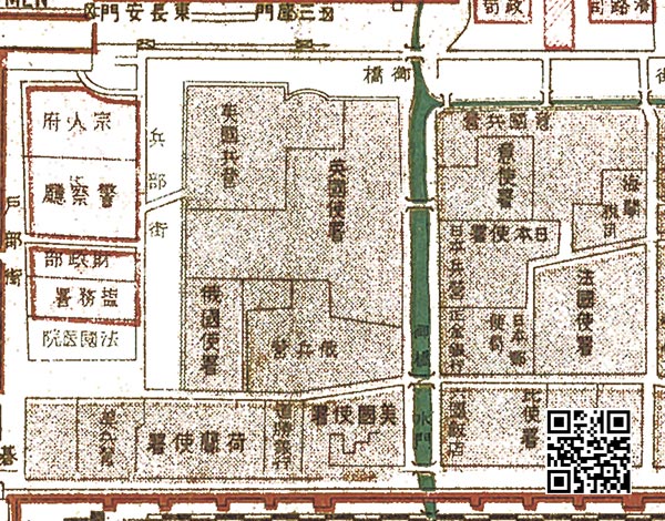 义和团运动结束后,各国开始在东交民巷附近圈地建设,英国使馆占用了原址北面的翰林院,日本使馆占用了部分肃王府和柴火栏,中御河桥东南还修建了六国饭店。最初这座饭店只是一幢两层的小楼,1909年在原址扩建为一座三层砖石结构的法国古典式建筑,成为当时北京最好的饭店。1910年秋,在六国饭店的北侧修建了横滨正金银行。1931-1933年,御河被掩盖填平,河道上成为花园。