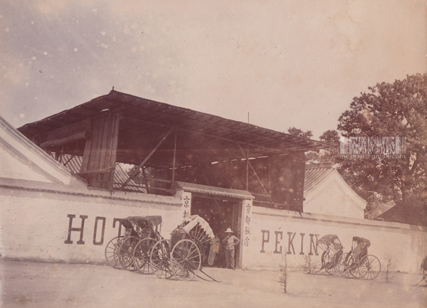 上文提到“北京饭店”的招牌是1900年挂上的。请允许我在这里矫情一下:这“北京饭店”最初开设的时候是只面向西方人的,用的是西文名字,而且是法文(Pékin Hotel),直译过来的确可以作“北京饭店”,那当时的中文招牌一定就是“北京饭店”四个字吗?正好为今年的秋拍征集到一张照片,是1900-1901年间这座饭店的门面,如下图:
