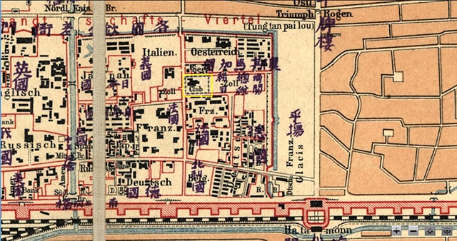 另外根据上面那段北京饭店历史的介绍,大胆猜测了下饭店在搬去长安街前的旧址。义和团运动期间“北京饭店”的建筑遭到破坏,因此在战事平息后迁到法国兵营北面。世界图书馆有一张的国人1901年绘制的北京地图,在法国兵营背面有个地方标注为“club”,这似乎很符合“酒馆”、“饭店”一类的作用。我把这张地图覆到Google Earth上等比例放大,位置大概就在今台基厂头条西端路北。