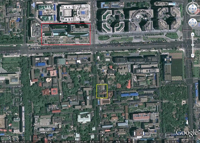Google Earth,红框内是现在的北京饭店,黄框内是疑似的北京饭店旧址