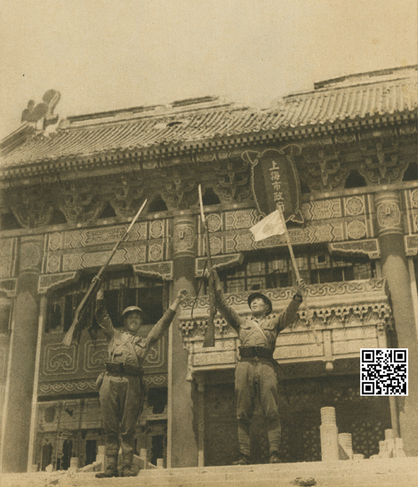 日本军人在被占领的上海市政府大楼前欢呼胜利,后面的建筑满目疮痍