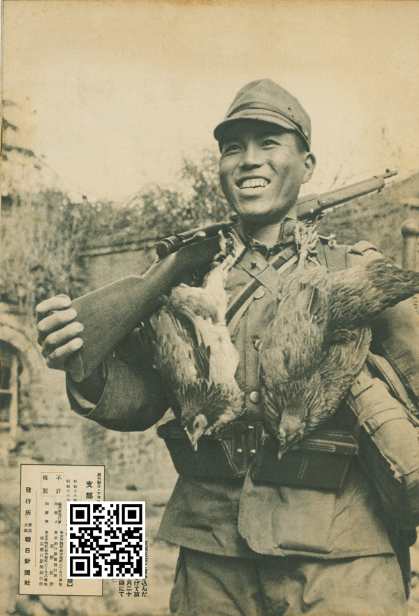 中国人熟悉的小鬼子形象。不知道当时留守家园的日本人民有没有想过那两只鸡是怎么来的