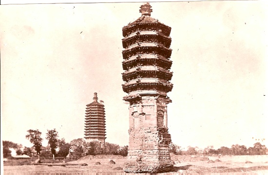 同样和我有这些疑问的还有黑龙兄,我们有过几次讨论都无果。后来在互联网上发现的一组1860-1870年间拍摄的老照片中又发现了这座塔的身影,因为拍摄时间更早,还能看到一座小的覆钵塔、一通赑屃驮石碑和城墙。