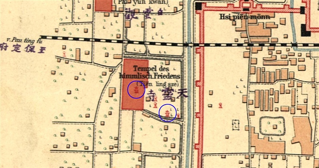 世界图书馆建立,在中国组下发布了一张1902年德国人绘制的北京地图。黑龙兄眼尖,注意到在天宁寺塔东南不远还有一个塔的标志,两塔之间是一大块坟地。我们一致认为那座不知名的塔应该就是之前照片里那座小塔。