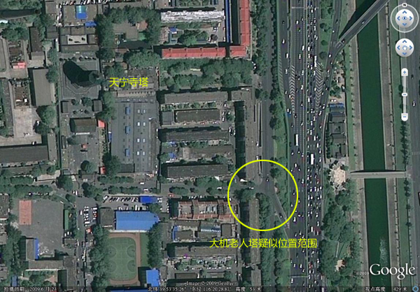 世界图书馆里的那幅德国人1902年绘制的北京地图。左上篮圈是天宁寺塔,右下篮圈是不知名塔,中间都是坟地