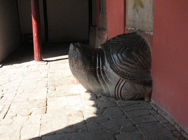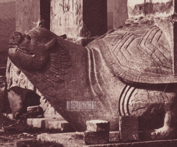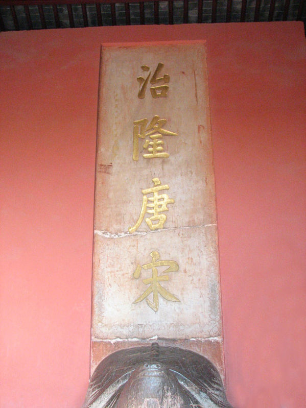 明孝陵过文武方门,就是碑殿,殿内是著名的“治隆唐宋”碑。这通碑是康熙第三次南巡(康熙三十八年,1699年),拜谒明孝陵的时候立的,碑高3米多(现存3.85米),传为曹雪芹祖父,时任“江南织造”的曹寅所立。“治隆唐宋”是说明太祖朱元璋治理国家胜过唐、宋。看起来是褒奖之意,可大清朝是夺的大明江山,那肯定是说自己比朱元璋还厉害了。本来想多找些这座碑的资料,不想Google的搜索结果多是关于“缩头乌龟”的,因为驮“治隆唐宋”碑的赑屃头特别的短,好像缩着脖子一样。有说这是“千古之谜”的,也有比较客观的说法认为赑屃头部有伤,可能是被损毁后修补过。看到这张照片,可以帮这只赑屃洗刷“缩头乌龟”的屈辱了,人家的脖子和头原来可都是好好的,而且很典型的清早期风格。太平天国运动期间,明孝陵一度是交火激烈的战场,很多建筑被(焚)毁。从这张照片上看,这通碑在拍摄的时候(约1880年代)仍保存完整。借用网友cglvl拍摄、发布在百度贴吧的照片(http://tieba.baidu.com/f?kz=334259276),现在的碑已经没了碑头,碑身也曾经断为两截,不得不用砖墙固定。