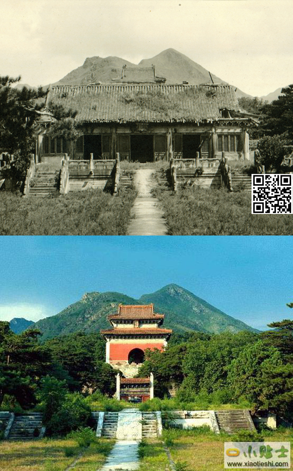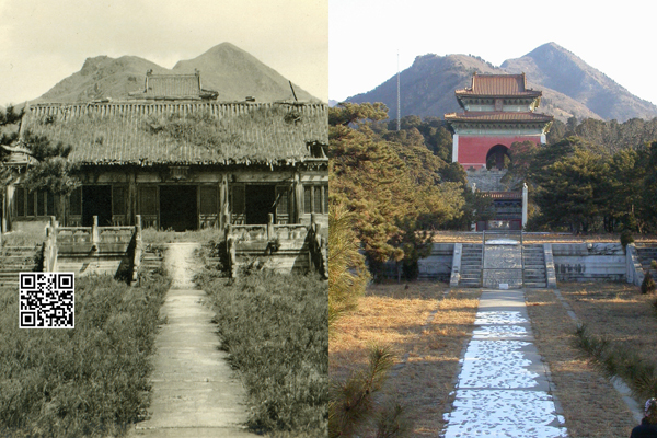 明代帝王陵的几个主要组成部分就是园门、棱恩门、棱恩殿、明楼和宝城。这张照片里只能看到残破的棱恩殿和明楼的楼顶,对我这样不熟悉明代陵墓的人来说实在算不上特征,唯有后面的山形比较有特点。一般来说,山形不会有太大的变化,于是我想了个最笨的办法——逐一筛选。我先列出明十三陵都包含哪些陵墓,然后以此为关键字在Google里面逐一搜索,哈,很快就找到明嘉靖帝的永陵最符合,甚至还发现几张拍摄角度接近的现状照片。