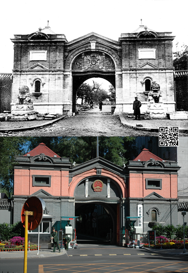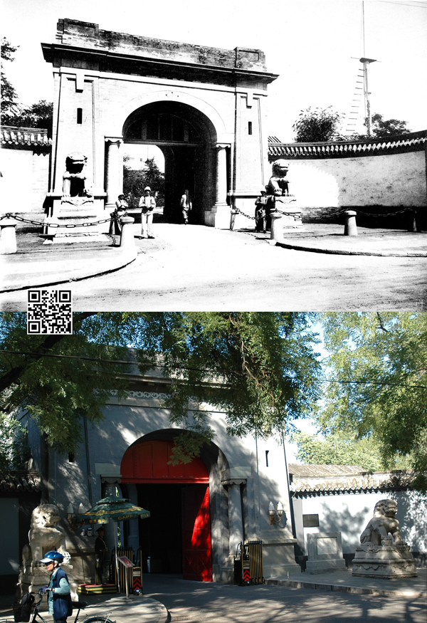 原英国馆大门,最明显的变化就是英国国徽没了,可以理解,这里已经是公安部了。老照片拍于1909年。