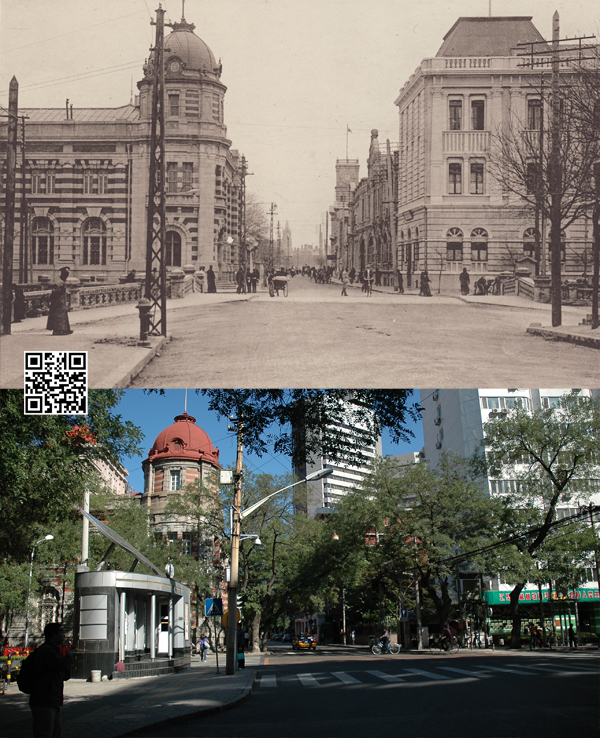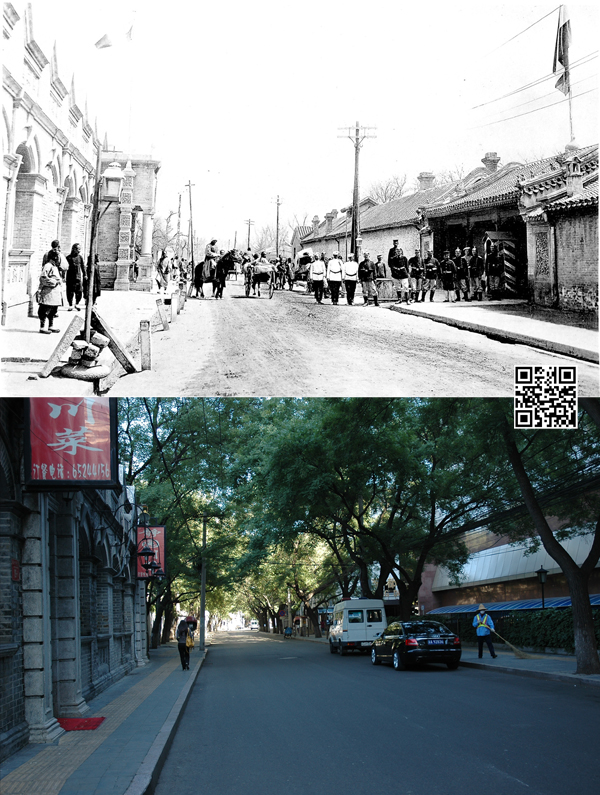 在法国邮局前向东望。邮局已经成了川菜馆,德国馆成了首都大酒店的一部分。老照片拍摄于1909年。