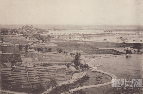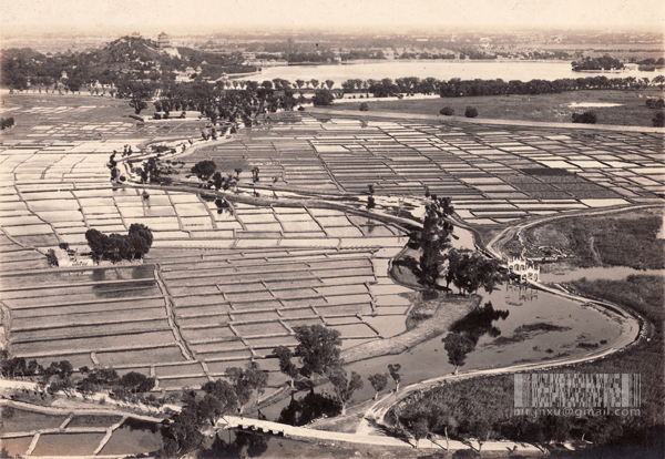 玉泉山景区的老照片看过不少,我最喜欢的就是颐和园和玉泉山中间的那块地方,曾经水田密布,一派江南景色,对我这个西北人来说很新鲜,当然现在地貌变化很大,河道改了,也看不见水田了。今天在韩素音写的(实际上就是图片说明)《China: 1890-1938 From The Warlords To World War》里面看到一张图片,是在玉泉山高处(可能是玉峰塔上)远眺颐和园,捎带上“水田”和部分玉泉山景区的全景照,由两张照片拼接而成,这个角度的全景照我第一次见。