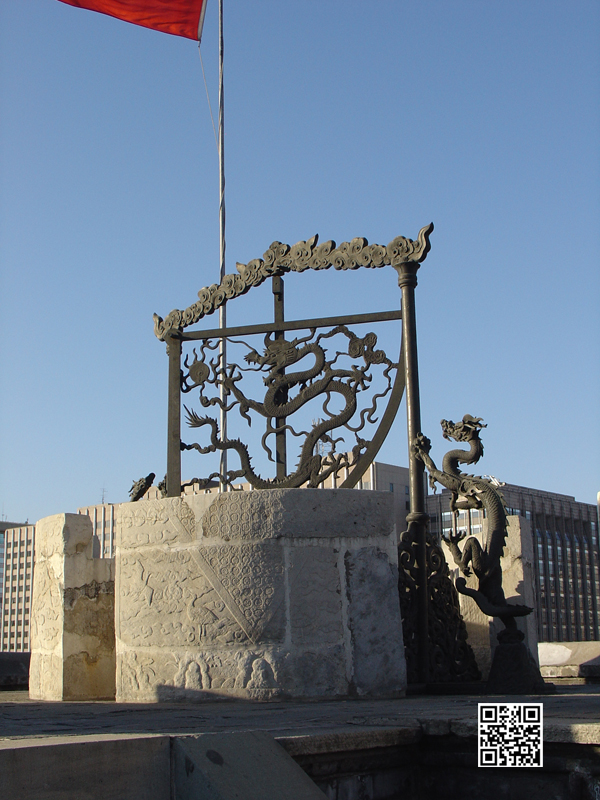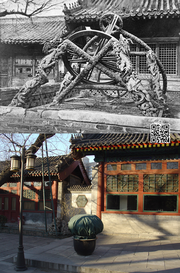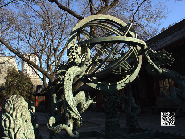 建国门地铁站C口出来就是观象台的入口,门票10元。明清时候古观象台作为国家的重要机关(观星和修订历法),附属建筑不少,但是清末之后逐渐衰落,现在除了观象台外只剩下北边紫微殿一个院落了,正殿和东西厢房被开辟成展厅,剩下的都是办公室。说实话,这次去观象台挺失望的,游人寥寥,除了我还有两个南方来的年轻人,院子里到处都透着一股机关的气息。我去的主要目的是按照老照片的角度拍现在的状态,之前准备了查尔德的四张照片,可是原来摆在紫微殿前的简仪和浑仪已经被移往南京的紫金山天文台,现在只有复制品,虽然做的很精致,但毕竟和原物没法比,而且位置挪动了。台下拍不成只好往台上走,上去一看,所有的仪器都被栏杆围着,外面一个铁将军把守。问了旁边小屋里的姑娘,被告知有文物局的批条才能近前观看,我磨了半天,说只是拍张照片,小姑娘立场坚定就是不肯。也难怪,周围都是摄像头,把我放进去了她也不好和领导交差,可是不能靠近看看这些清朝鼎盛时期科学和艺术的结晶,10块钱的门票实在有些冤,非要逼我找局长!草草拍了几张,加之太冷,只好悻悻离去,等下做好“工作”,一定彻彻底底拍一次!