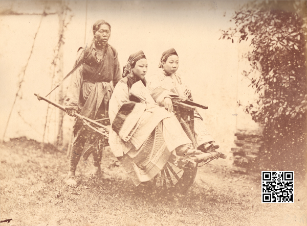 伯耐特先生的《中国摄影史:西方摄影师1861-1879》一书中,在介绍威廉·桑德斯的一节里引用了作者自己的一张收藏“Young Ladies”,两位裹脚的汉族妇女,衣着华丽,手持纸扇。看他们的衣着,虽然华丽但并不浮夸,头带也是已婚妇女的特有样式,应该不是来自青楼而是良家。如果是良家,那个时候能在镜头前抛头露面真是不易。我觉得感兴趣的,是这两位妇女太眼熟了,我在另一张照片上见过她们。桑德斯的编号为3,名为“A Celestial Cab” 的照片中,这两个人坐在一辆独轮车上,穿着同样的衣服。而且这张乘独轮车的照片还被转制为木版画发表在1876年10月28日的《伦敦新闻画报》上,只是画师在背景加上了个赌场的招牌,旁边附了几支花。1870年代这两位中国模特在镜头前显得很自如,想来已经比较适应摄影术了。对于摄影师,能让还未开化,和自己不同语系的人能放松的站在照相机前,这是本事,两个中国妇女能这么早这么快接受新事物,这是意识,都不容易。不过,这两个模特总是让我想起现在北京上海大街上那些挎着老外腰的年轻MM们……