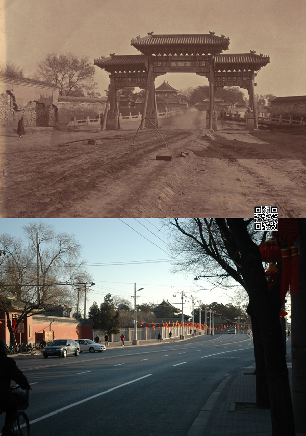 北海大桥两端原来各有一座四柱三间牌坊,西曰金鳌,东曰玉蝀。1955年11月,因为“阻碍”交通而被拆除,移至陶然亭公园重建,后又在文革时被毁。如今的北海大桥拓宽了,牌坊也没有了,光秃秃的。一直想对照老照片拍一张新照片,看看牌坊应该在什么位置,总是因为各种原因而没有实施。今天上午去北海公园旁边的国图分馆,因为早,先在附近拍了几张照片,突然想起那个重拍的计划,可是没带着老照片,索性凭感觉拍了几张。回家一看,我佩服死自己了,第一张就和我要比对的老照片严丝合缝,根本不需要作任何调整。我把牌坊合成到今天新拍的照片里,重现一下消失了五十多年的金鳌坊。