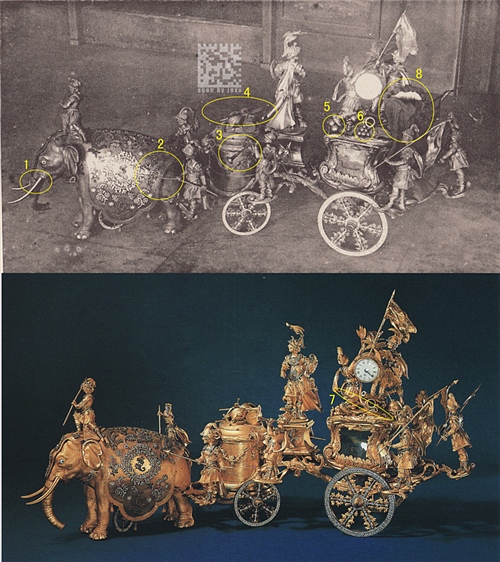 1、象鼻和象头连接处不一样,1901年的时候连接处镶嵌了珠宝,类似象头上的装饰,而现在是一个光秃秃的箍。