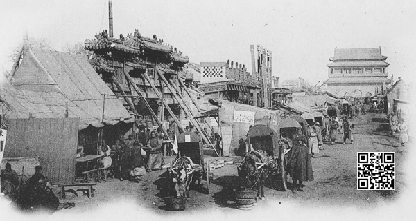 1901年法国人拍摄的地安门大街,是一张少见的火德真君庙牌楼近景照片