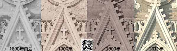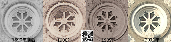 四个时期西什库教堂圆窗的比较,看得出庚子前后玻璃花窗的修复还是按照原来的图案