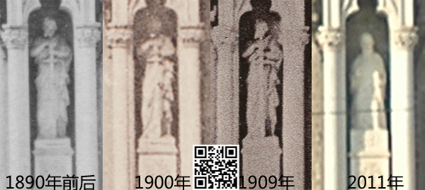 目前可以找到的最早的西什库教堂的照片大概就拍摄于1890年前后,因为看建筑细节很干净,周围的树也还没有长大;到了1900年,经过战火的洗礼,教堂正立面千疮百孔,破损较明显的是圆窗、圆窗东侧的砖墙、西侧碑亭的鸱吻;尽管在庚子事变结束后教堂得到修复,并加高一层,但是重建后的碑亭鸱吻换了,别的没有太大变化;而现在,正立面的几尊圣像和以前不一样、正门上的十字架没有了、两尊石狮子换了、三座尖塔上各增加了一个天使。