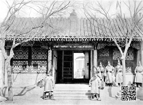 两边站立的士兵来自穆莫相册中的这张照片,就是站在前面这两位。这张照片是从德国使馆往大门外面看,正对着德国使馆大门的是沙蒙夫妇的北京饭店