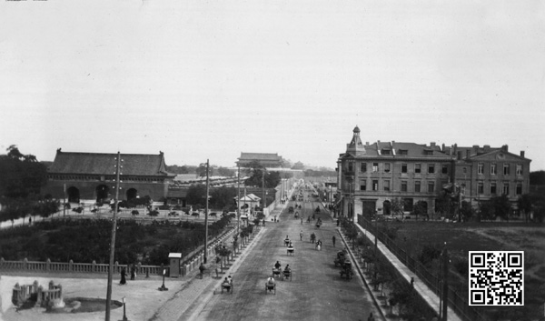 1910年代初,出自《北京写真帖》,千步廊还没有拆,那排新修复的朝房被拆,东交民巷西口的法国医院建立