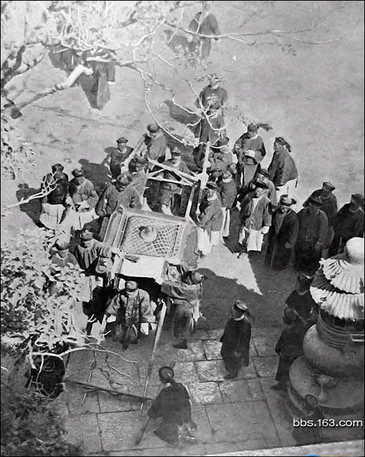网上找来的图,光绪(?其他官员可能不配八抬轿)正走出轿子准备进入观音庙