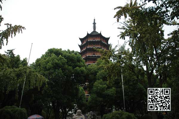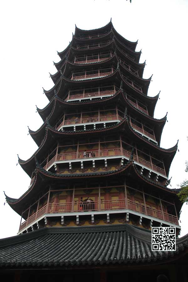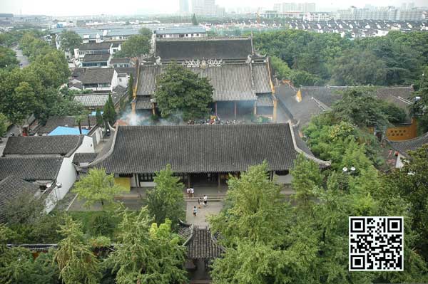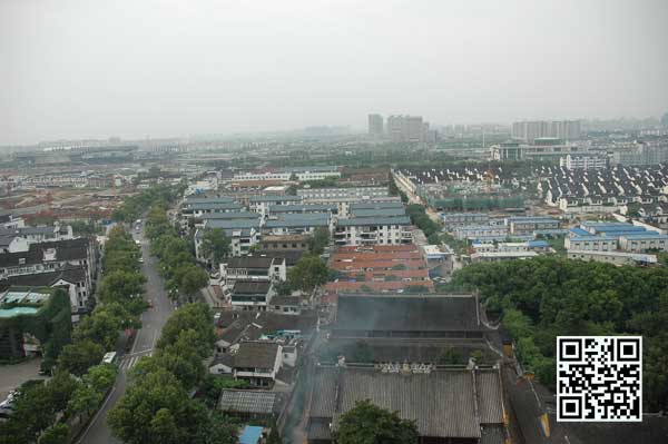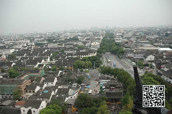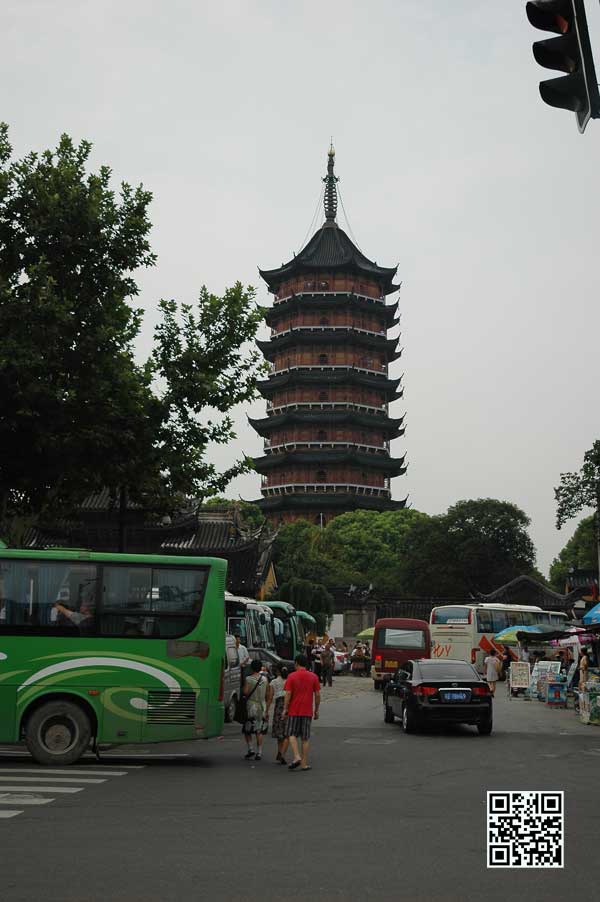 报恩寺始建于三国吴赤乌十年(247)至十三年(252),初名通玄寺,唐代开元二十六年(738),唐玄宗诏命天下各大郡置寺,以年号为寺名,故将通玄寺易名为“开元寺”。北宋崇宁三年(1104)端阳节,报恩寺迎请佛牙舍利,徽宗赵佶写《佛牙舍利赞》一文,并赐寺号“万岁”,寺遂易名“报恩万岁寺”,南宋淳熙五年(1245),又奉名为“报恩万岁贤首教寺”。该寺自隋代起便屡毁屡建,至今保存最古之建筑就是号称江南第一高的砖木塔北寺塔(建于南宋)和寺内东部的楠木观音殿(建于明代)。北寺塔平面八角九级,外壁挑出木构腰檐,八面均开壶门,塔高76米,沿塔内回廊层层登级可至塔顶,在外廊俯瞰苏州城。不过,塔外廊的地面均向下倾,站在栏杆边上很忐忑,同去的同事恐高,留影的时候一直紧紧抓着围栏。