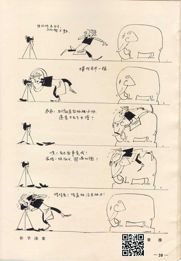 这期的漫画仍然由叶浅予创作,画中老王为了自拍一张与石像生的合影,废了一盒胶片也没成。里面提到“暗盒没有抽出”,这个暗盒是专门存放胶卷的部分,装在镜箱后,后来随着相机的小型化和135胶卷的流行,暗盒和镜箱合为一体,这种设计一直保持到现在。当然,现在也有“后背”的概念,一般玩儿针孔或大画幅的多用。记得之前把玩过一只拍摄玻璃干片的立体照相机,暗盒也是单独的部分,设计极精巧,可以在不打开的情况下“卷”片(暗盒可放12张底片)。