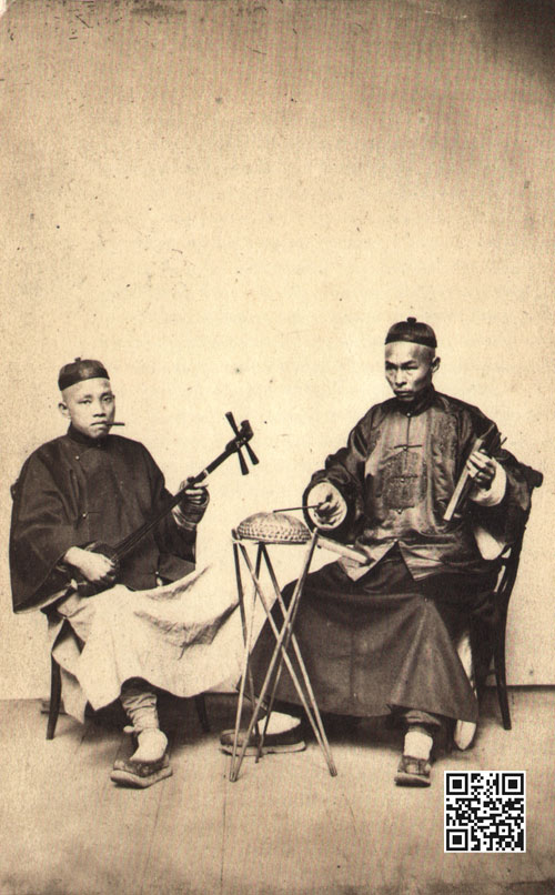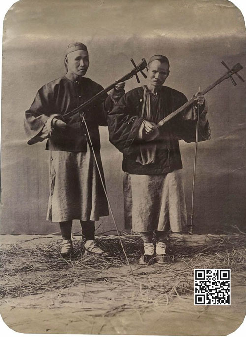在这些演奏“组合”里,最常见的是琵琶、笛子、二胡和唢呐的四重奏,还有三弦、萧、扬琴和二胡的四重奏,最低等级的就是盲乞丐的二胡组合,这样的现在地铁或者地下通道也还能看见。这些我觉得都算南乐,广州那边的,也有江南的,比如鼓书,是三弦、大鼓和快板的组合,这样的少见些,可能和广州当时的摄影术比较发达有关系,南乐被记录的机会多。