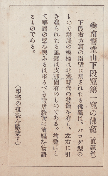 张驭寰先生所著《中国塔》一书根据外形对塔的分类中,有一种叫做宝箧印式塔,样式特别,我在这批老照片中只找到一张这种塔的形象,就是南响堂石窟下段窟第一窟的佛龛。