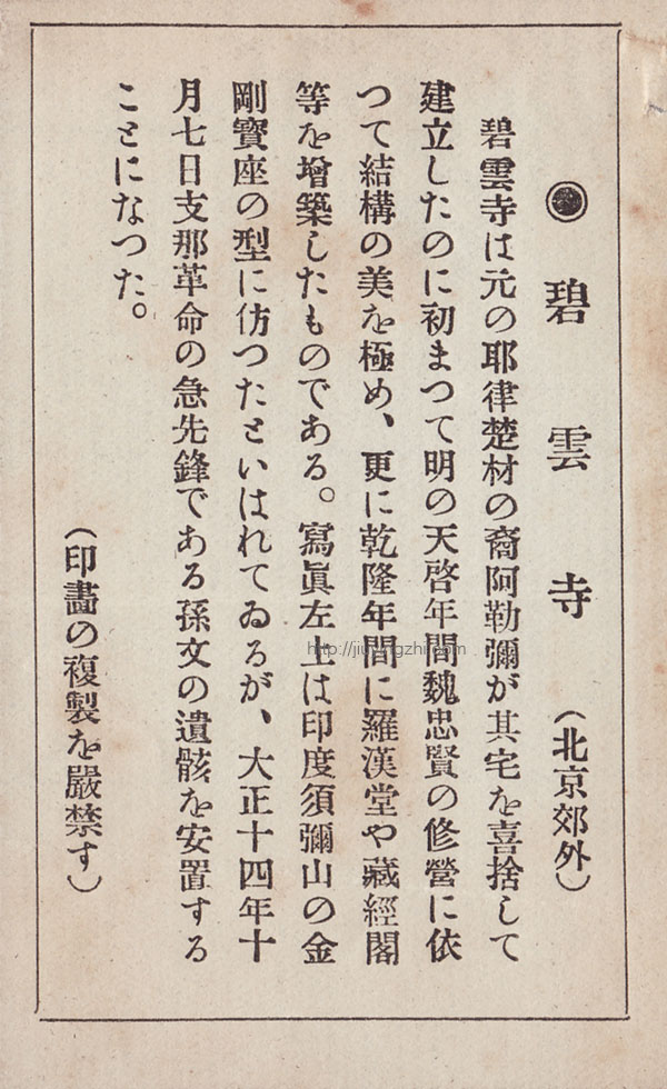 按照中国塔的分类,碧云寺塔是典型的金刚宝座塔,在同批照片中目前我只发现这一个例子,还好,使我制作的这个塔系列比较完整。张老师解释,金刚宝座通俗的说法就是佛成正果时的坐处。按佛教的意思,这地方永不陷毁,所以名金刚,也是佛的道场,在这地方建塔,叫金刚塔。金刚界五佛即五智所成的如来,按其方位是:中佛,大日如来,法界体性智所成;东佛,阿閦如来,大圆镜智所成;南佛,宝生如来,平等性智所成;西佛,无量寿如来,妙观察智所成;北佛,不空成就如来,成所作智所成。建于金刚宝座上的塔,一般都是这五位佛的体现。张老师还说这种金刚宝座塔在唐代就开始修建,但是在明代比较盛行,北京的真觉寺塔就是成化年间的。