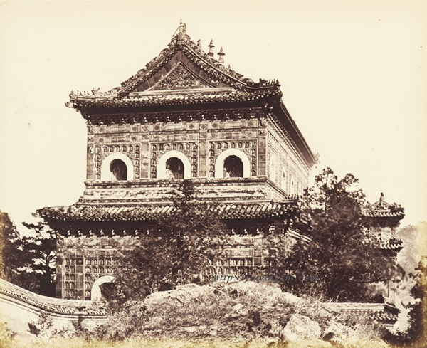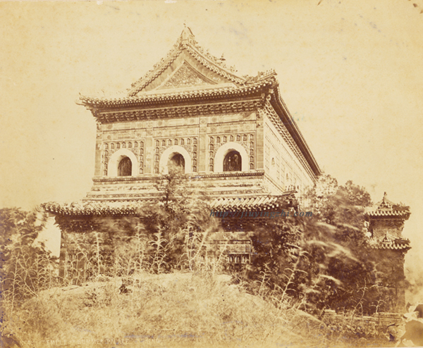 智慧海是清漪园(今颐和园)大报恩延寿寺的建筑之一,位于万寿山最顶端,是分隔前后山的界限,因为周身琉璃而躲过1860年英法联军的大火。清漪园中其他的建筑就没这么幸运了,尤其是离它最近的“佛香阁”,被烧的片瓦无存。中国皇家园林虽多经过战火的蹂躏,但遭受的最严重的破坏还是来自我们自己人。土匪、强盗、官绅、百姓都有去挖墙脚的,圆明园就是一个很好的例子。从这张照片上也可以看出一二。Beato的片子拍摄于1860年火烧颐和园之后,Child的片子拍摄于1877年,仅相隔十余年,就能看出原本完整的智慧海边墙已残破不堪。