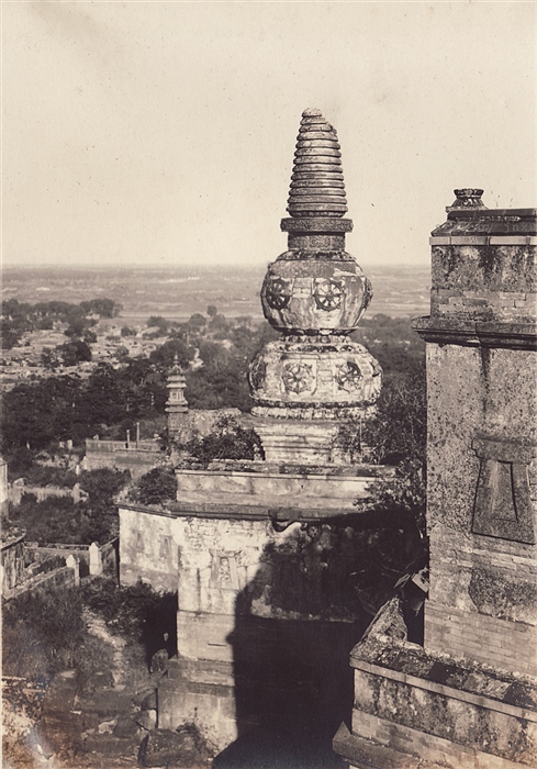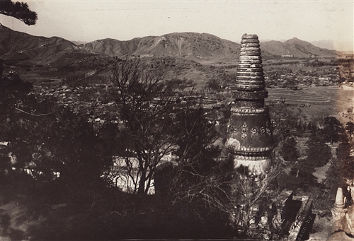 两张照片都拍摄于20世纪20年代末,那个时候颐和园北还是很荒的地方,不像现在热闹非凡,人口不多建筑也少,所以视界很开阔能看很远。第一张照片向西北方向拍的,在塔身中部右侧一点还能看到远处(北宫门外)有座覆钵式的和尚塔,从风格上看肯定是清的,能在皇家园林门口修坟要么这儿原来有座大庙要么这得是位高僧。第二张照片向东北方向拍的,还能看到万寿山脚下的花承阁琉璃塔。可惜后边的建筑群不是很清楚。