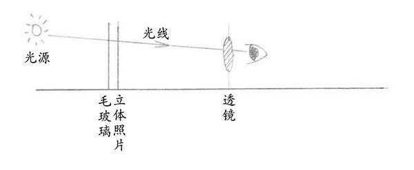 立体照片按照不同的标准可以有很多分类,比如,按照片洗印工艺可以分为达盖银板照片、蛋白银盐照片、明胶银盐照片和(丝网或胶版)印刷品;按基底的材质可以分为金属、玻璃的和纸的;按规格来分也有不同的尺寸。不过,讨论观看方式,我们只按照基底的透光情况来分,即透明、不透明和半透明。为了比较好的解释,我针对这三种情况手绘了三张示意图。