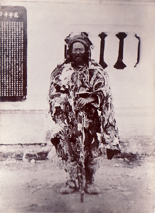 很明显,这两张照片都摄于上海龙华寺,而且也都是同一个乞丐。旧时中国,(大)寺庙前多乞丐(其实现在也差不多),能烧香拜佛的多数还算能也愿意施舍的。能被两位不同的摄影师在不同的时间拍摄下,想来这个乞丐也不就是在此地很出名,或者衣衫褴褛的程度很高,能引起猎奇的外国摄影师的关注,再有一种可能就是此乞丐会围着外国人讨钱……什么原因被留在影像里已不可考,但这个老乞丐的形象却巧合的能流传100多年甚至还将继续流传下去,不容易。
