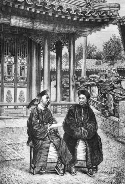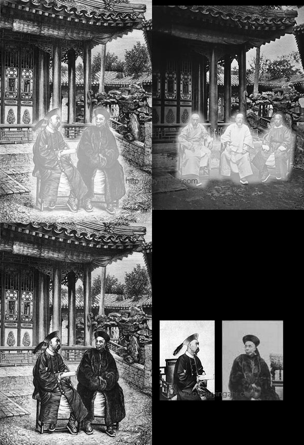 这张木刻版画应该出自一份西文画报,具体的出处我没有查到。大家之所以关心照片里的大员是谁,是因为照片的背景脱自约翰·汤姆逊1871年为总理衙门三位大臣(从左至右)沈桂芬、董恂、毛昶熙拍摄的合影。那次拍摄活动中,除了这三位大臣,汤姆逊还为主持总理衙门的恭亲王奕訢、文祥、宝鋆、成林等人拍了照片,也就是说,当时总理衙门的大员们都拍照了,所有的照片都和版画里的两人不合。从以上推测,版画里这两个人应该也是很重要官员吧,否则怎么会有这么一张“相”?