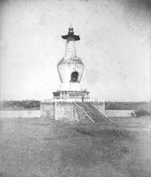 登上五亭桥极目而南,可见白塔耸峙,即莲性寺塔。莲性寺始建于隋唐年间,原称法海寺,元代重建,康熙皇帝在清康熙四十四年南巡时赐名莲性寺。塔于清代由两淮盐业商总江春集资营建,有五十三级石阶通往塔下须弥座,塔身通白苗条,覆钵状,南向辟一壸门拱白衣大士造像。十三天上有金顶华盖,缀青铜璎珞,塔顶宝瓶状。我所见莲性寺白塔最早的照片同样拍摄于1880年代,周边建筑已经毁于咸丰年间的太平天国之乱,仅有“一枝孤塔”。