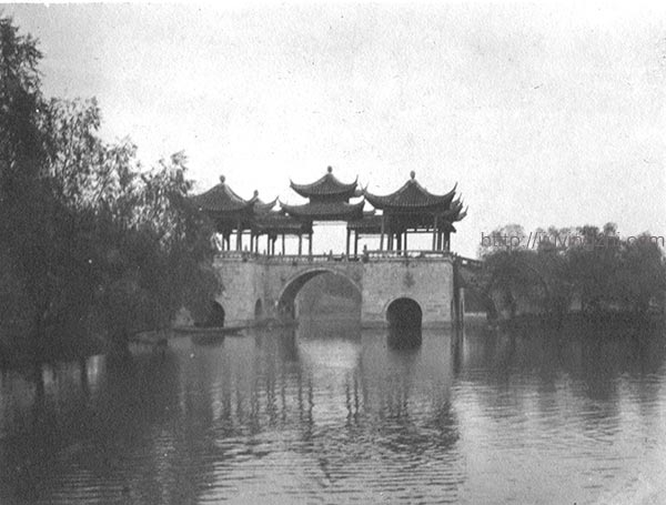 去扬州,一定要去瘦西湖。瘦西湖原称保障湖,系历代城濠连缀而成,其水源又与大运河相通。乾隆元年,杭州诗人汪沆慕来这里游览,看到扬州商业的繁荣,觉得这里像杭州一样“也是销金一锅子”,指保障湖“应唤作瘦西湖”。后来扬州的盐商疏浚湖水,又在周边新建了很多附属建筑,使这一代成为著名的“旅游区”。跨瘦西湖有一座五亭桥,系清乾隆二十二年,巡盐御史高恒挟两淮盐业重资所筑。桥下工字形石台,“桥洞正侧凡十有五”,台上四翼及中间各建一亭,并有廊相连,造型独特,富江南之秀。有说法此桥在咸丰年间毁于战火,直到民国二十二年方才重建。此说不确。从现在的图像资料看,至少在1880年代桥、亭都还保存完好。民国二十二年确实有过重建,因为1920年代有仅余石台的照片。