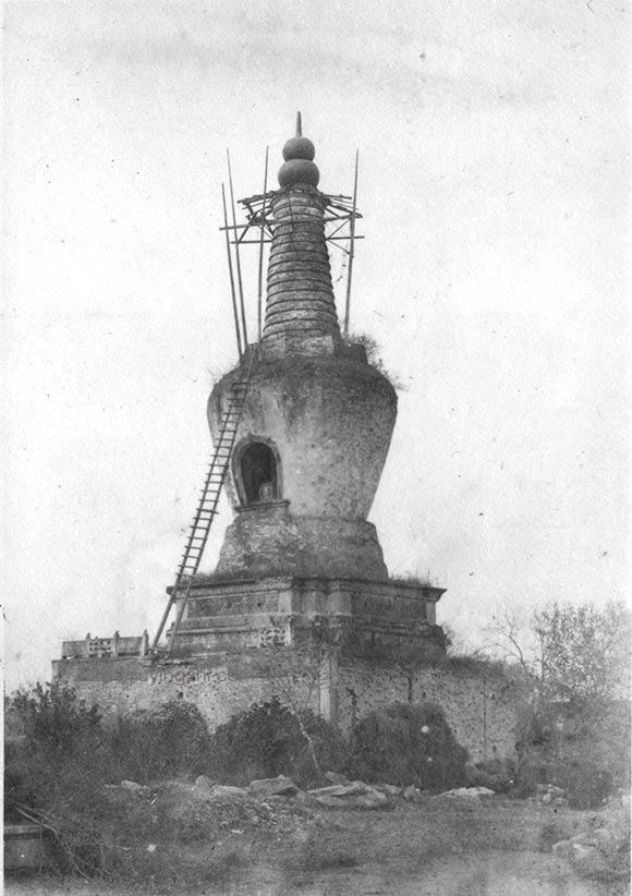 破败不堪的莲性寺白塔,金轮宝盖、璎珞、石栏杆都残毁了,1915年