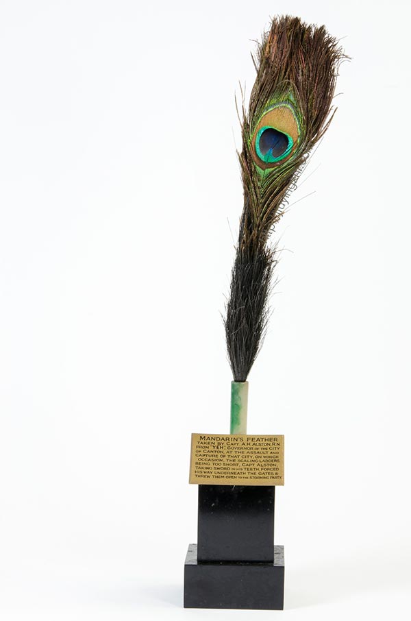 在英国皇室众多的收藏品中,有一支孔雀翎毛。漂亮的翎毛是雄孔雀的尾羽,可以在求偶的时候加分。而在清代中国,雄孔雀的翎毛又被作为官员和贵族的冠饰,称花翎。花翎分一眼,二眼,三眼,以三眼最尊贵。其中“眼”即指的是孔雀翎上的眼状圆斑,一个圆斑就算做一眼。在清朝初期,五品以上的内大臣、前锋营和护军营的各统领、参领有资格享戴单眼花翎。英国皇室收藏的这枚孔雀翎毛就是一枝单眼花翎,根部还配有一枚翡翠翎管。此件藏品的说明是这样写的:在攻打广州城时,由奥尔斯顿上尉从两广总督叶处“获得”(taken)。也就是说,这支单眼花翎曾经属于广东巡抚叶名琛。