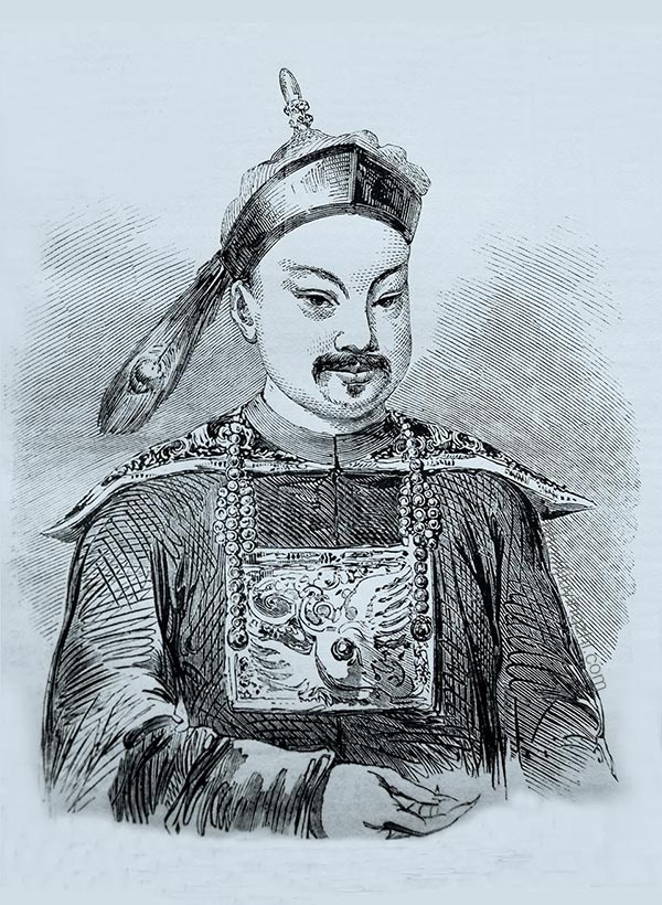 叶名琛(1807-1859),字芸珍,号崑臣,湖北汉阳人。叶名琛幼年时家境很好,汉口的著名老字号药店“叶开泰”即其家族创办和经营。叶名琛于道光五年(1825)中副贡生,道光十五年(1835)考取进士,选庶吉士,散馆授编修。道光十八年(1838)任陕西兴安府知府,其后历任山西雁平道、云南按察使、湖南布政使、江宁布政使、广东布政使等官,道光二十七年(1847)升任广东巡抚。道光二十九年(1849),与两广总督徐广缙一同阻止英国人在鸦片战争后进入广州城而封一等男爵。咸丰元年(1851),赏加太子少保衔;咸丰二年(1852),升任两广总督;咸丰五年(1855),加封为两广总督协办大学士、体仁阁大学士。官至两广总督擢授体仁阁大学士。1858年底,英法联军占领河南各炮台,要求叶名琛十天内出面谈判,但叶名琛回信拒绝。广州城陷后,1859年1月5日,叶名琛在广州副都统双禧的衙署内被擒获,解往停泊在香港的军舰“无畏号”, 48天后,“无畏号”驶往印度加尔各答,暂被囚禁在威廉炮台,后迁往大里恩寺,日诵《吕祖经》不辍,自书“海上苏武”。次年二月二十九日得病不食,至三月初七戌时(4月9日),死于囚所(一说咸丰八年三月二十三绝食卒于加尔各答),据说是自备粮食尽空后绝食而死。英国人将他的尸体运回中国。