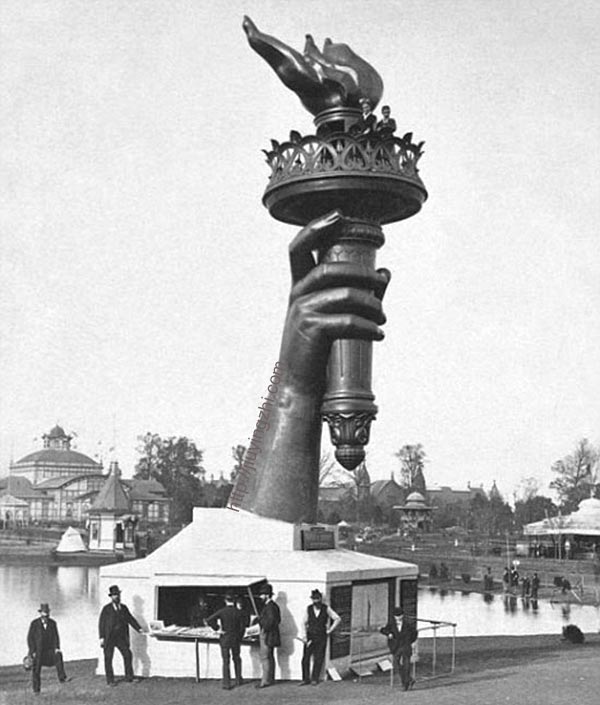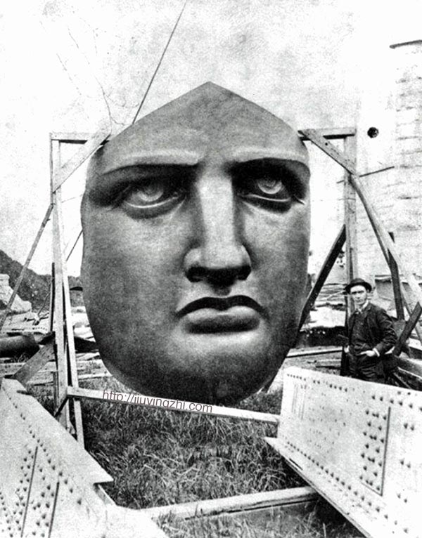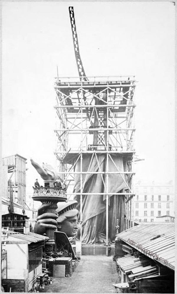正如张荫桓在日记中所说“此为法国赠美国自主之像”,这尊塑像是法国送给美国的礼物,以庆祝南北战争的结束和奴隶制的废除。塑像的设计者法国人巴特勒迪(Frédéric Auguste Bartholdi, 1834-1904)在获得时任美国总统格兰特的支持后,法国和美国分别成立建设委员会,由法国负责塑像的设计、制作和运输,美国负责塑像底座的建设。最先完成的是塑像的举火炬手臂部分,并在1876年8月运往美国参加了费城百年博览会,之后又运往纽约的麦迪逊广场展出至1882年。之后完成的是塑像的头部,并于1878年安放在巴黎世博会的会场向公众展示。主持塑像内部结构的是后来设计建设了法国埃菲尔铁塔的居斯塔夫·埃菲尔(Alexandre Gustave Eiffel, 1832-1923)和埃菲尔的结构工程师莫里斯·克什兰(Maurice Koechlin, 1856-1946),他们确定采用铁桁架为内部支撑,压制成型的薄铜皮外表用铆钉挂接在桁架上,这样既可以减轻塑像的重量,也可以保证其在港口大风情况下的强度,实际上这种方法在当下的新建筑上应用的非常普遍。1884年7月4日,也就是在美国国庆日这天,塑像完成了在巴黎的组装并举行了完工仪式。