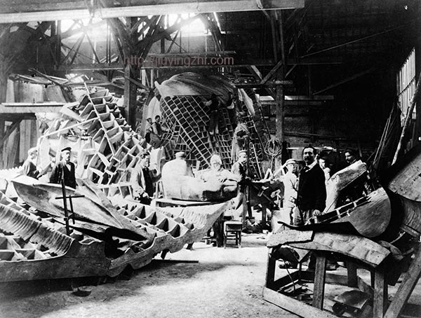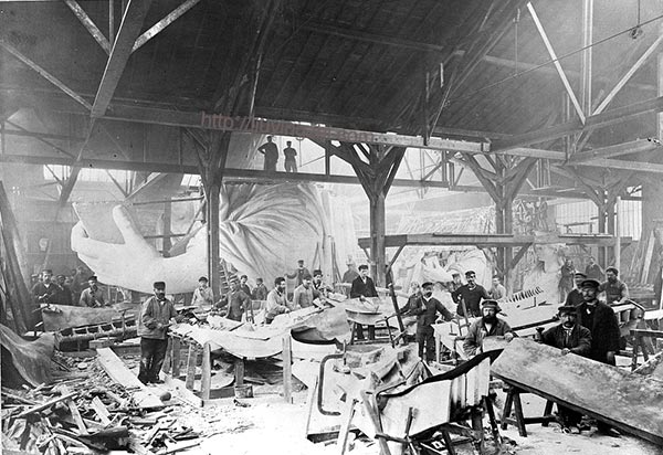 制作像身的巴黎工厂内景,可见自由女神像的1:1和1:4模型